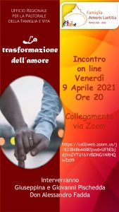 Venerdì 9 aprile, alle 20, è previsto un incontro formativo organizzato dall’Ufficio regionale Pastorale della famiglia e della vita. Interverranno Giuseppina e Giovanni Pischedda e don Alessandro Fadda. L’evento si svolgerà in streaming sulla piattaforma Zoom a questo indirizzo.