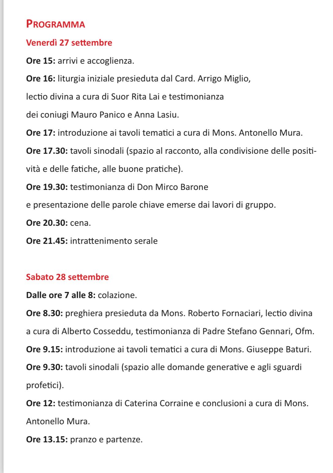 La giornata di sabato 28 settembre prenderà il via alle 8.30 con la preghiera, presieduta da monsignor Roberto Fornaciari, vescovo di Tempio-Ampurias, la «lectio divina» a cura di Alberto Cosseddu e la testimonianza di padre Stefano Gennari, dei Frati Minori.